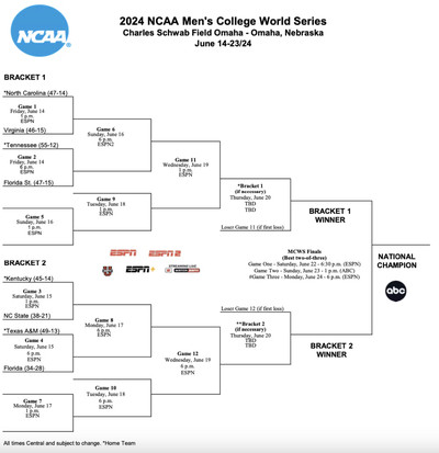 The Vols land in bracket one, which also features North Carolina and Virginia. Bracket two has Florida, Kentucky, NC State and Texas A&M. Featuring a double-elimination format, the two bracket winners will square off for the National Championship in a three-game series (June 22-24).