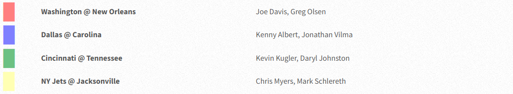 Getting the call for this game will be Kevin Kugler (play-by-play), Daryl Johnston (analyst), and Laura Okmin (sideline).