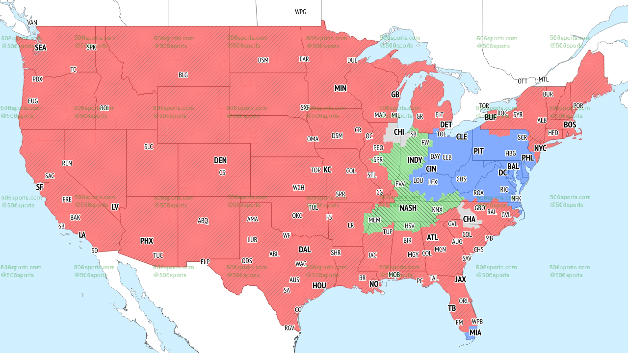 Those in the green region of the TV map will get the game on the local CBS channel.