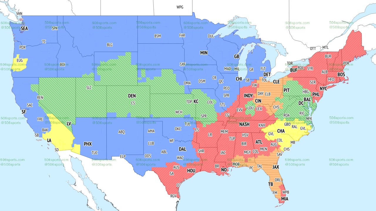 Those in the red region of the TV map will get the game on the local CBS channel.
