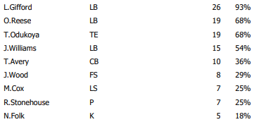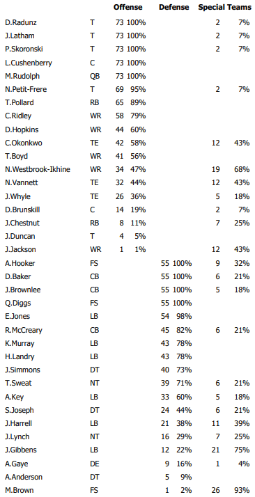 The Titans rotated a bit more on Sunday but that was largely due to the game being completely out of hand late. Still, 11 players took more than 56 percent of the snaps offensively and 11 took more than 60 percent of the snaps defensively.